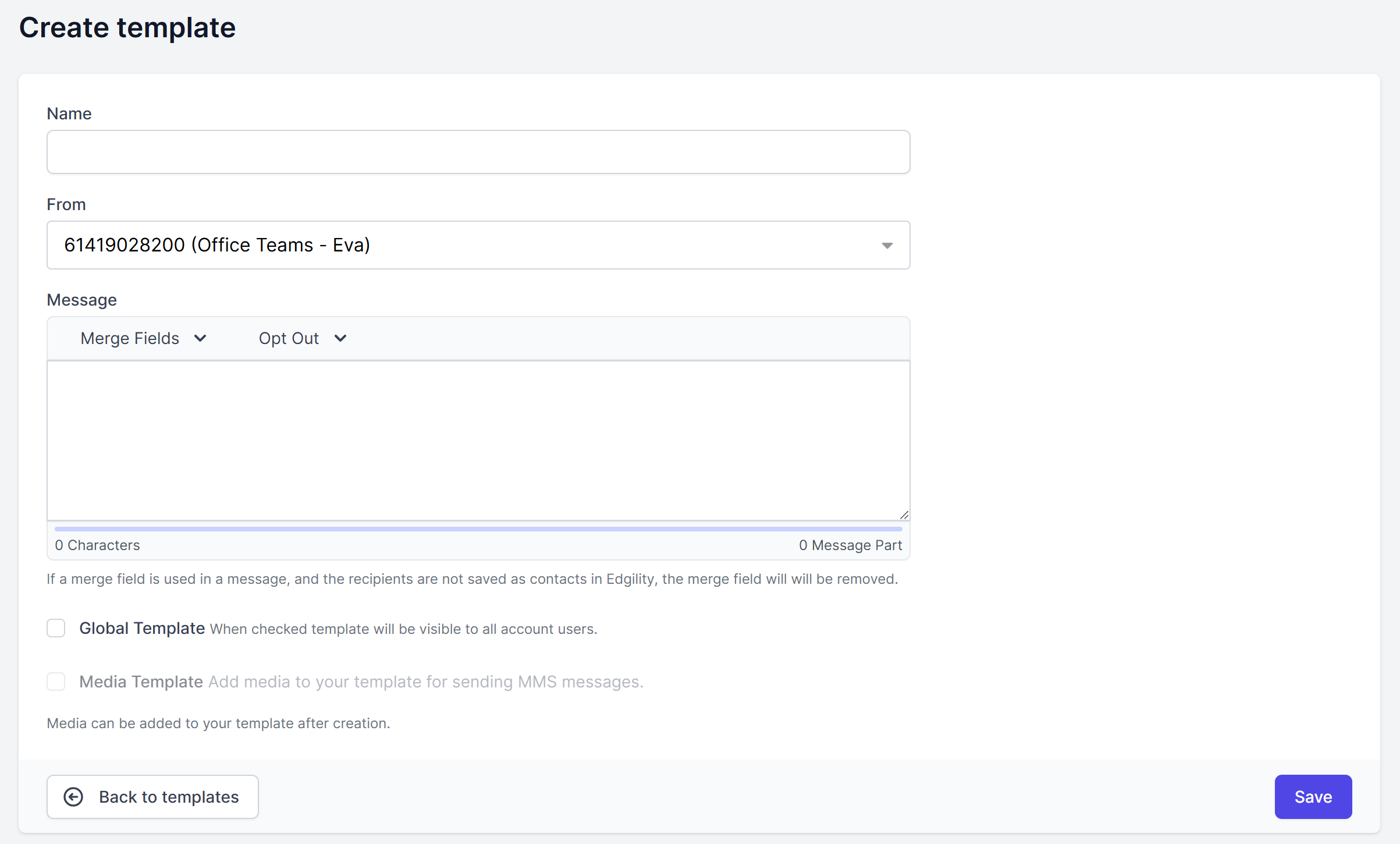 Name, select your Virtual Number and compose the text portion of your MMS first – media can be added to your template after it is saved.