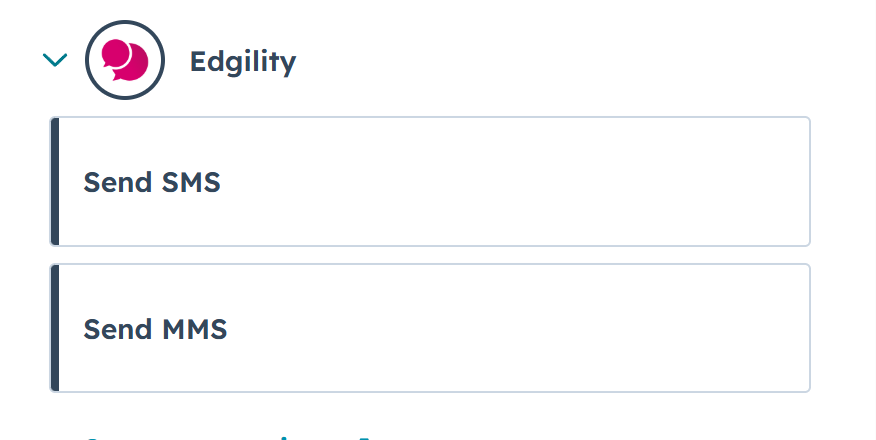 Our Edgility integration allows you to add inbound SMS as a trigger (if you have purchased a Virtual Number) or outbound SMS as an action in your HubSpot flows.
